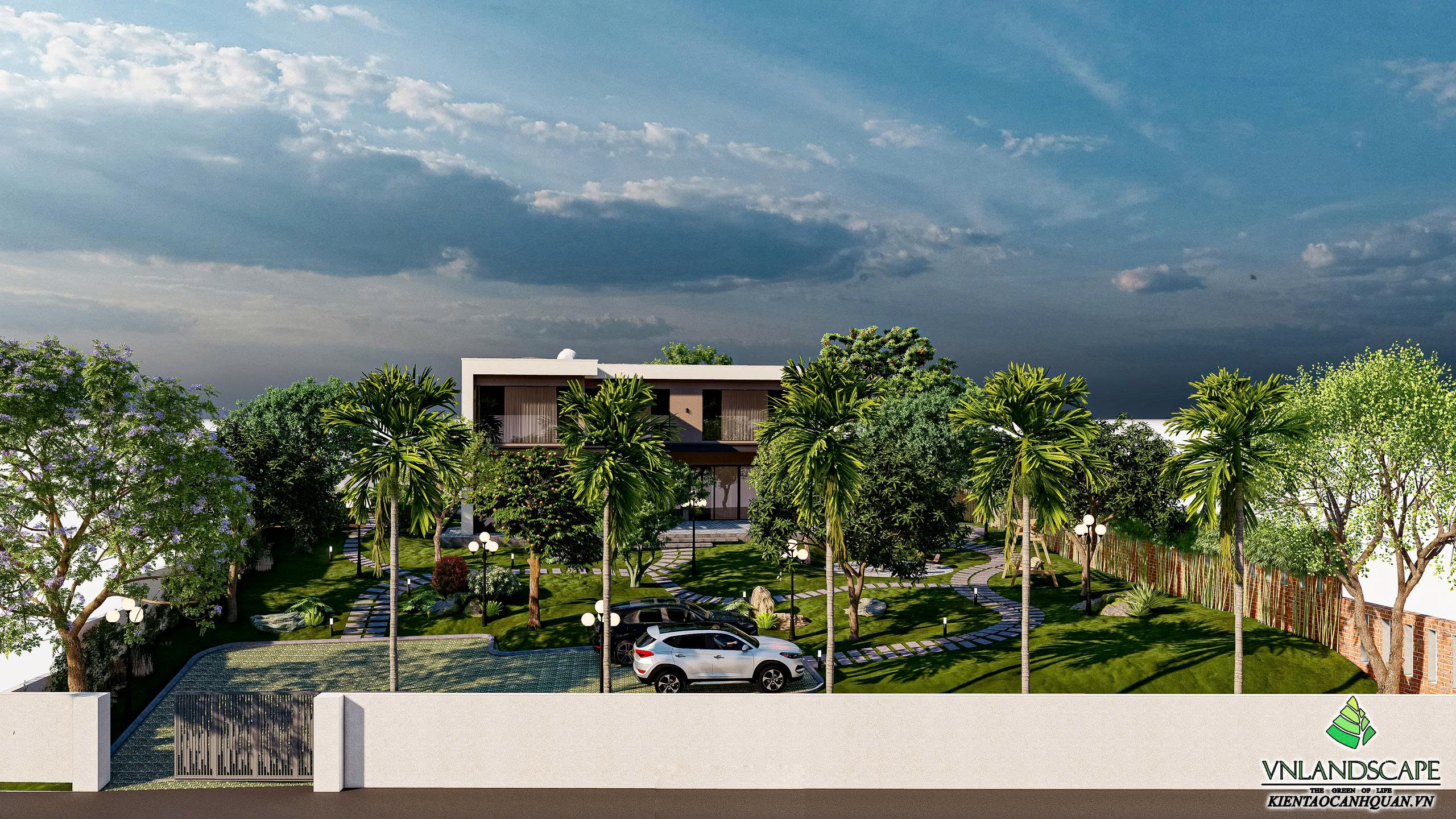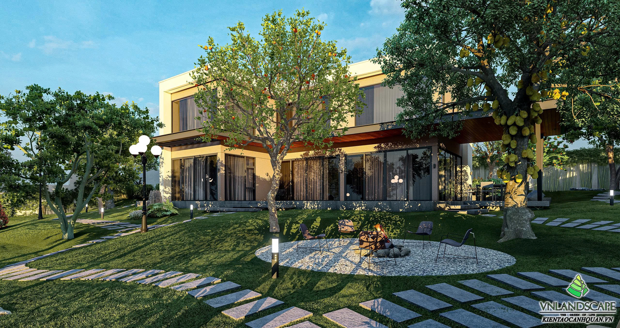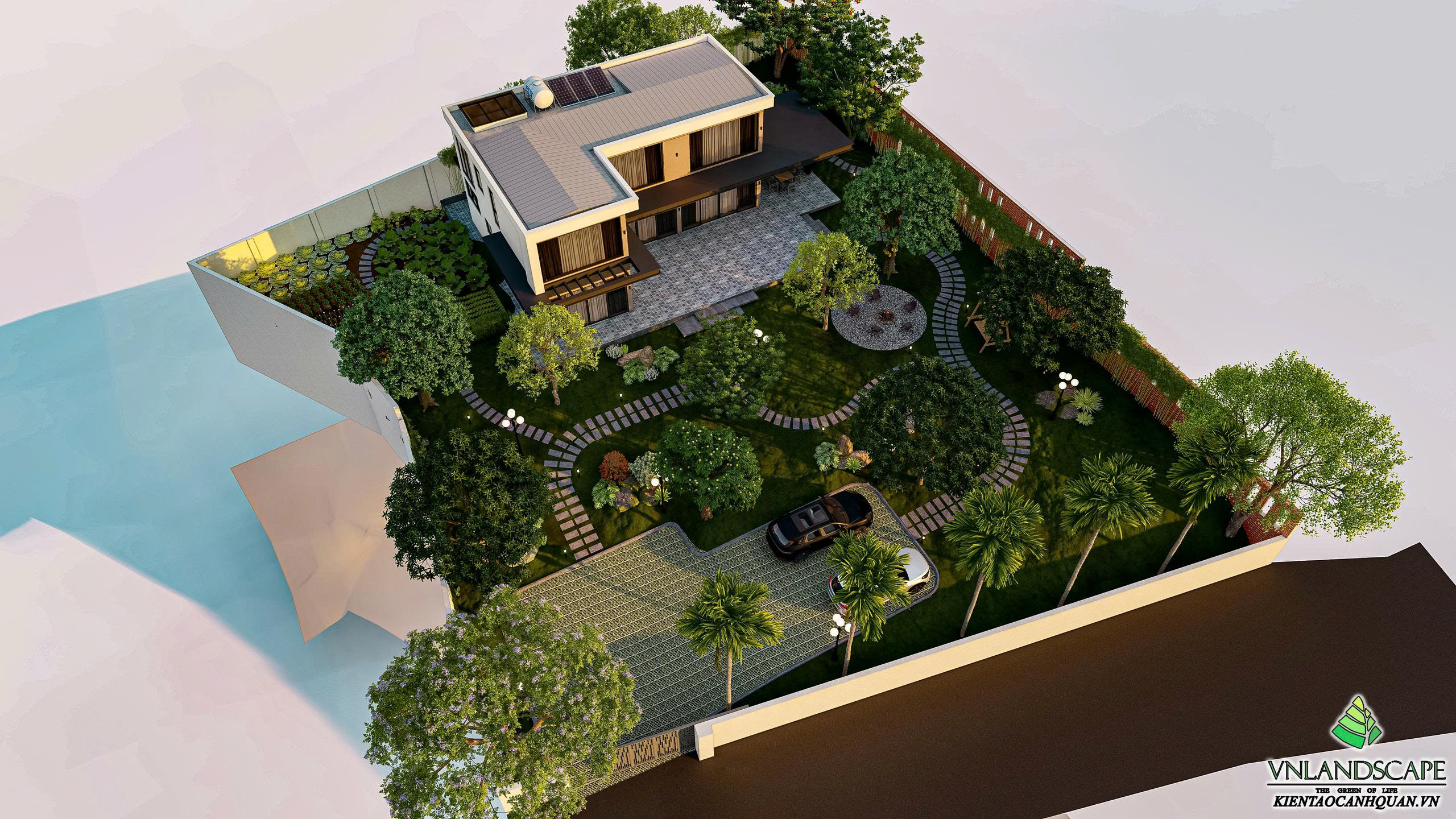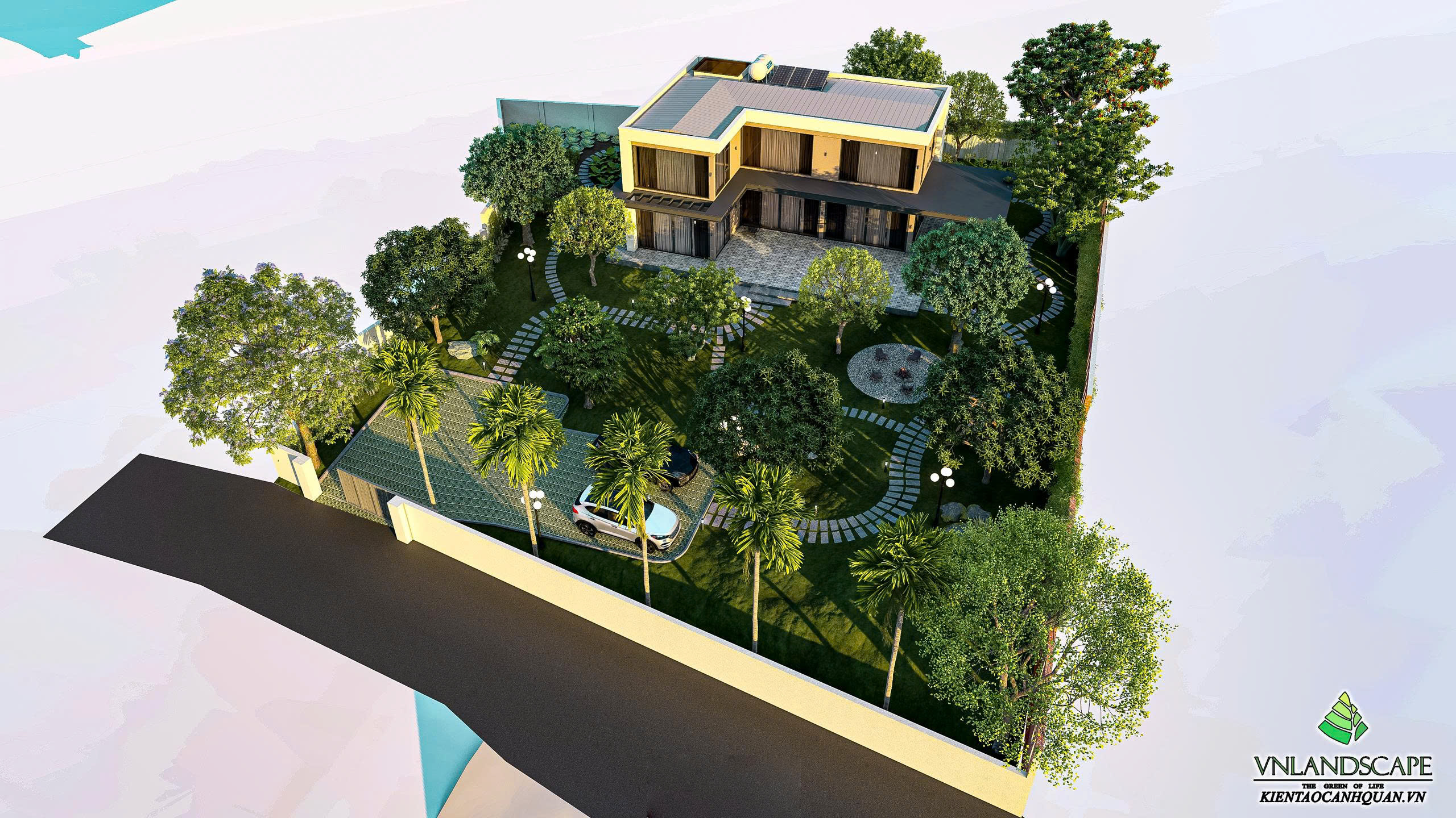 Khu nghỉ dưỡng của anh Vinh tại Hòa Lạc được thiết kế với triết lý “sống hòa cùng thiên nhiên”. Không gian cảnh quan mở, kết hợp hài hòa giữa mảng xanh cây cối, thảm cỏ, lối dạo uốn lượn, mang lại cảm giác thư giãn, tĩnh tại. Ngôi nhà mang phong cách hiện đại, đường nét kiến trúc tinh gọn, nổi bật giữa khung cảnh thiên nhiên xanh mát. Từng chi tiết trong thiết kế – từ bố cục sân vườn, cây trồng, đến hệ chiếu sáng – đều được cân nhắc kỹ lưỡng nhằm tạo nên một không gian nghỉ dưỡng riêng tư, thanh bình và tràn đầy năng lượng.