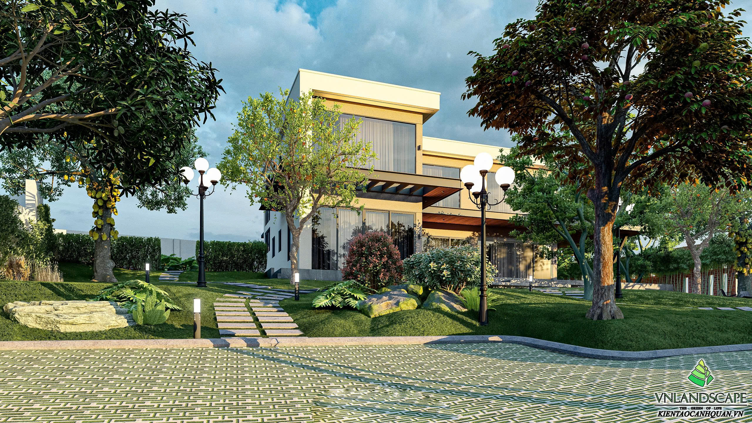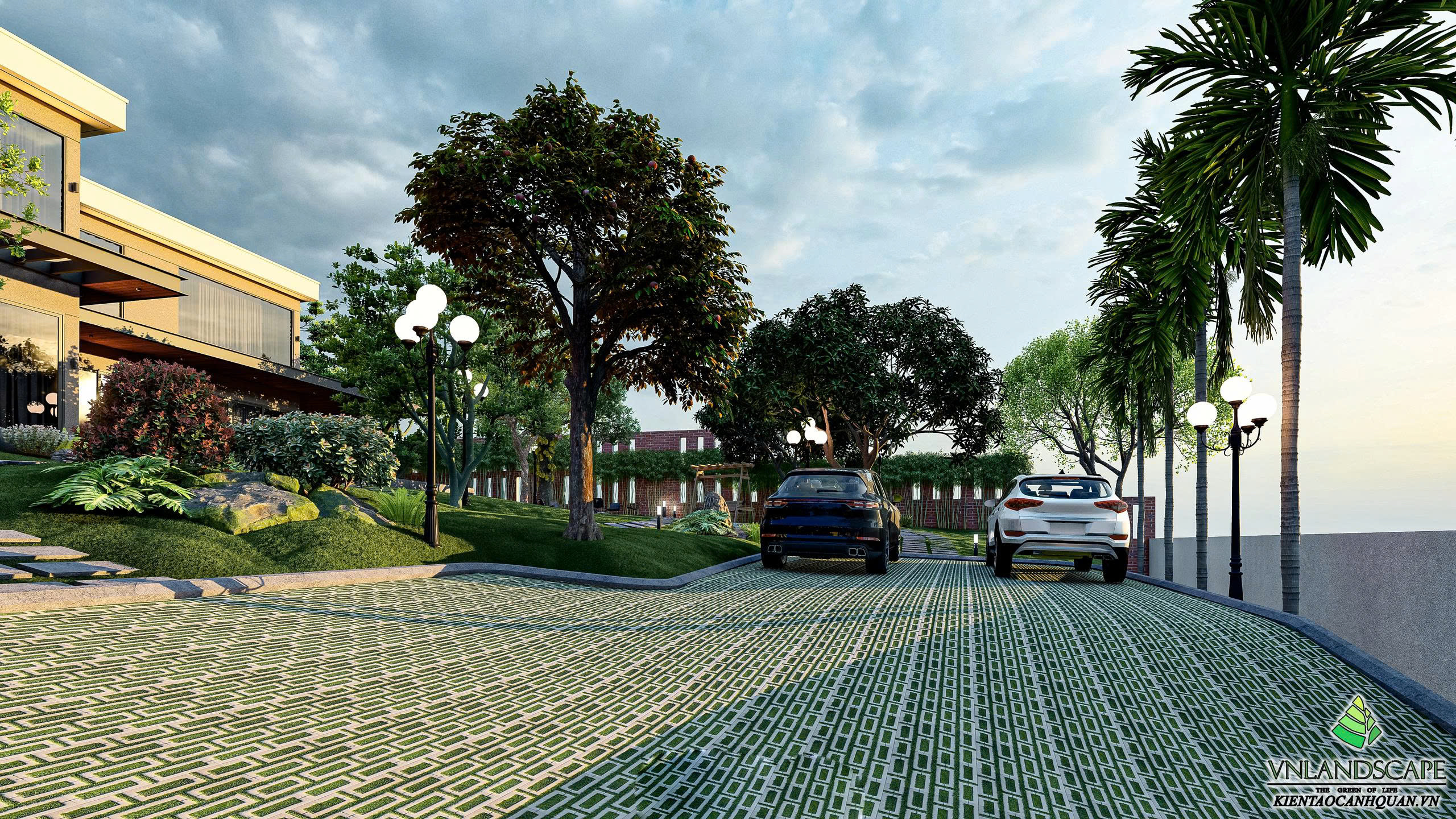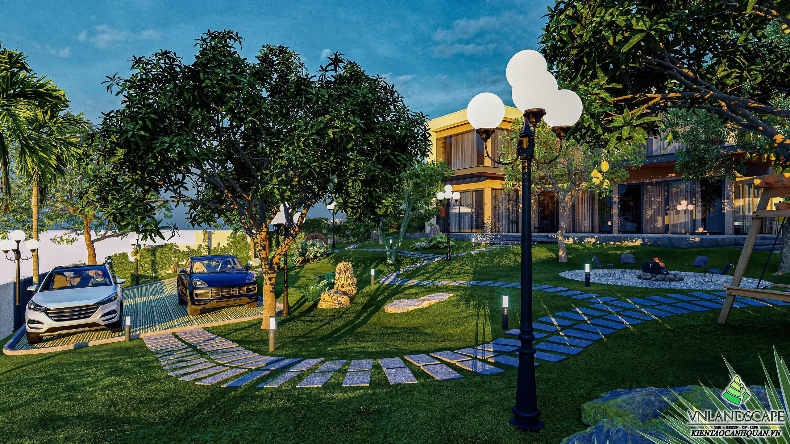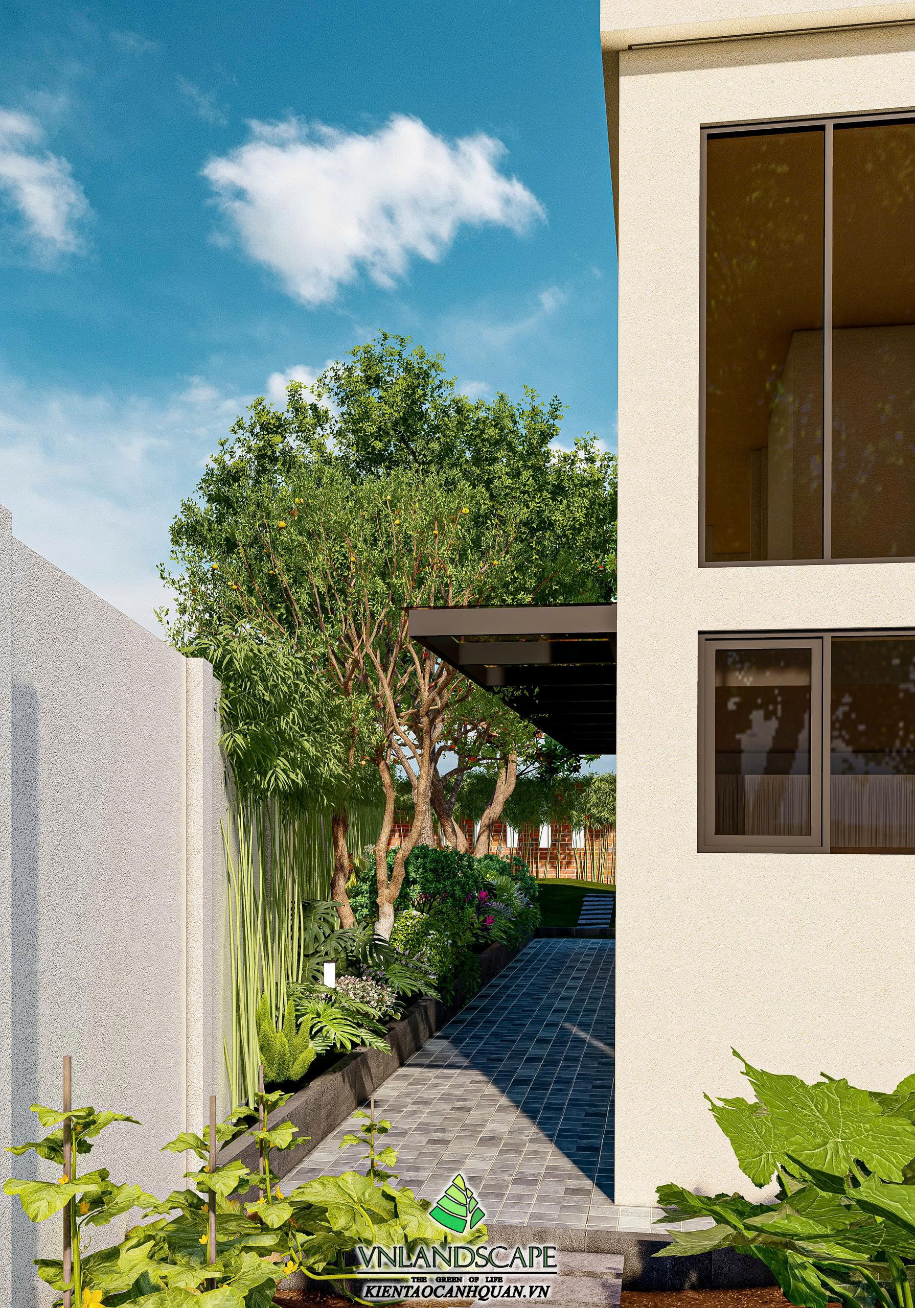 Khu nghỉ dưỡng của anh Vinh tại Hòa Lạc được thiết kế với triết lý “sống hòa cùng thiên nhiên”. Không gian cảnh quan mở, kết hợp hài hòa giữa mảng xanh cây cối, thảm cỏ, lối dạo uốn lượn, mang lại cảm giác thư giãn, tĩnh tại. Ngôi nhà mang phong cách hiện đại, đường nét kiến trúc tinh gọn, nổi bật giữa khung cảnh thiên nhiên xanh mát. Từng chi tiết trong thiết kế – từ bố cục sân vườn, cây trồng, đến hệ chiếu sáng – đều được cân nhắc kỹ lưỡng nhằm tạo nên một không gian nghỉ dưỡng riêng tư, thanh bình và tràn đầy năng lượng.