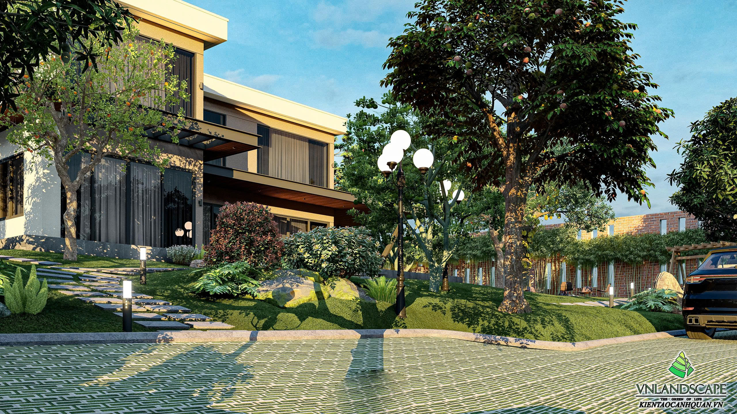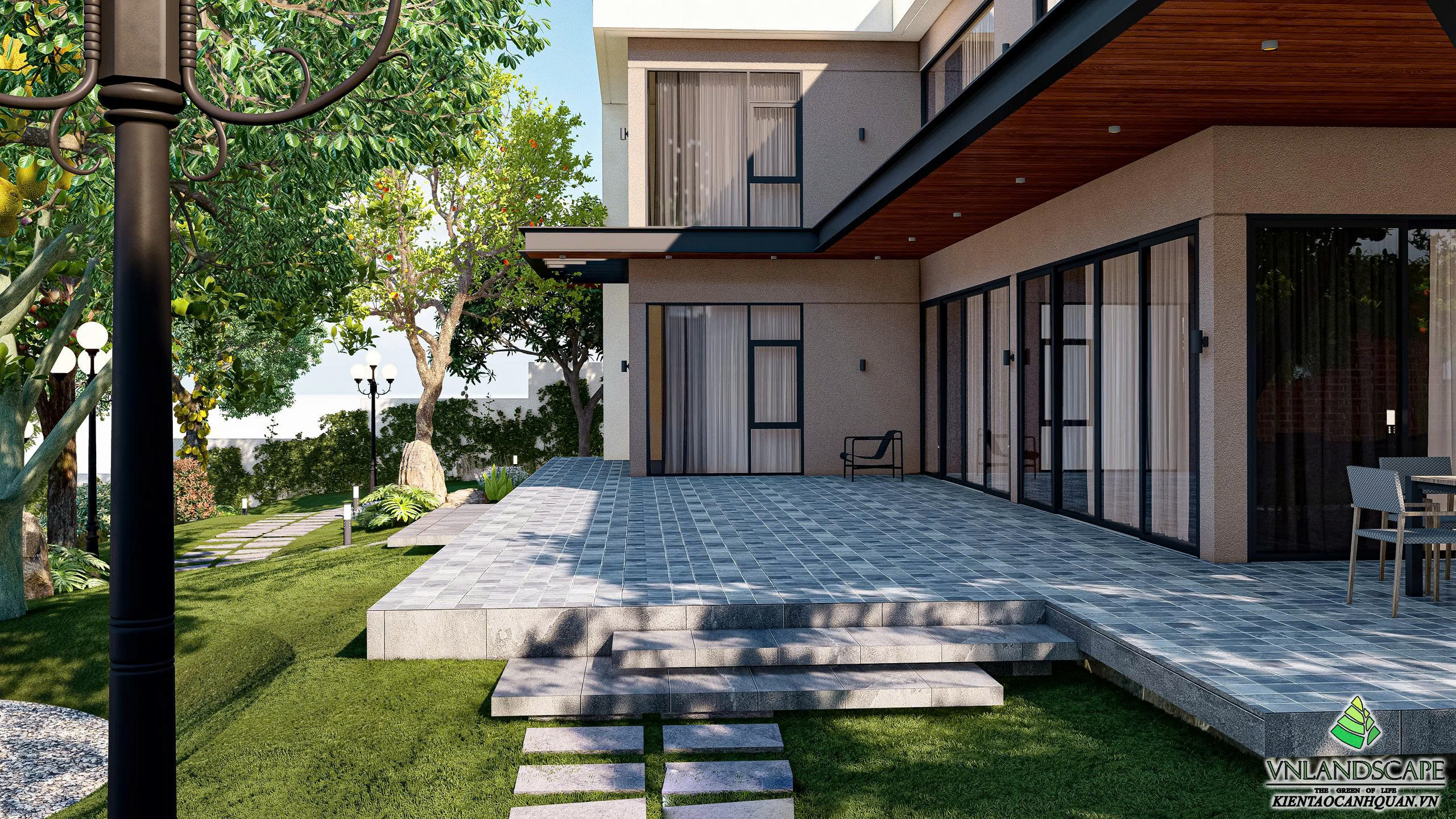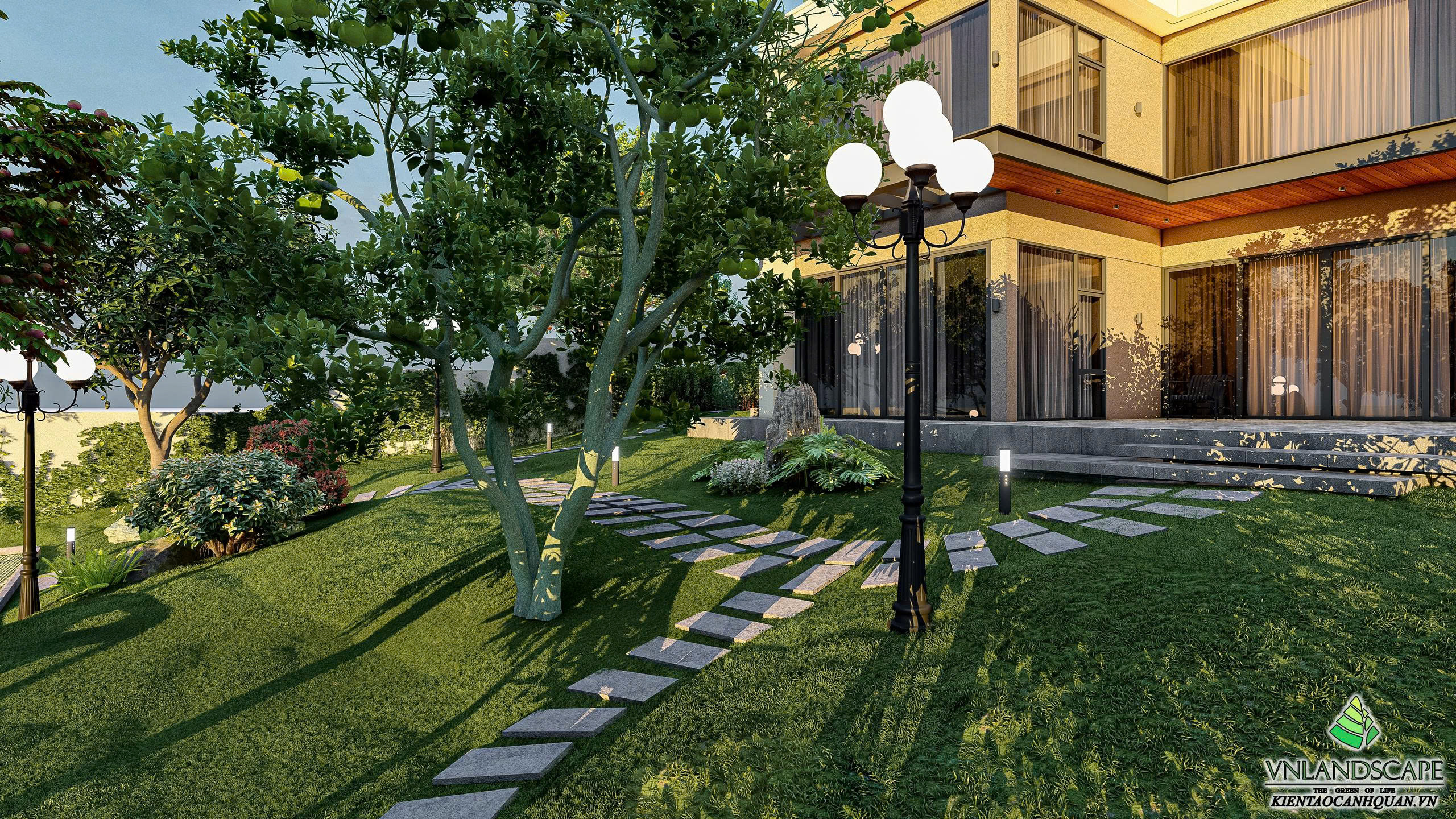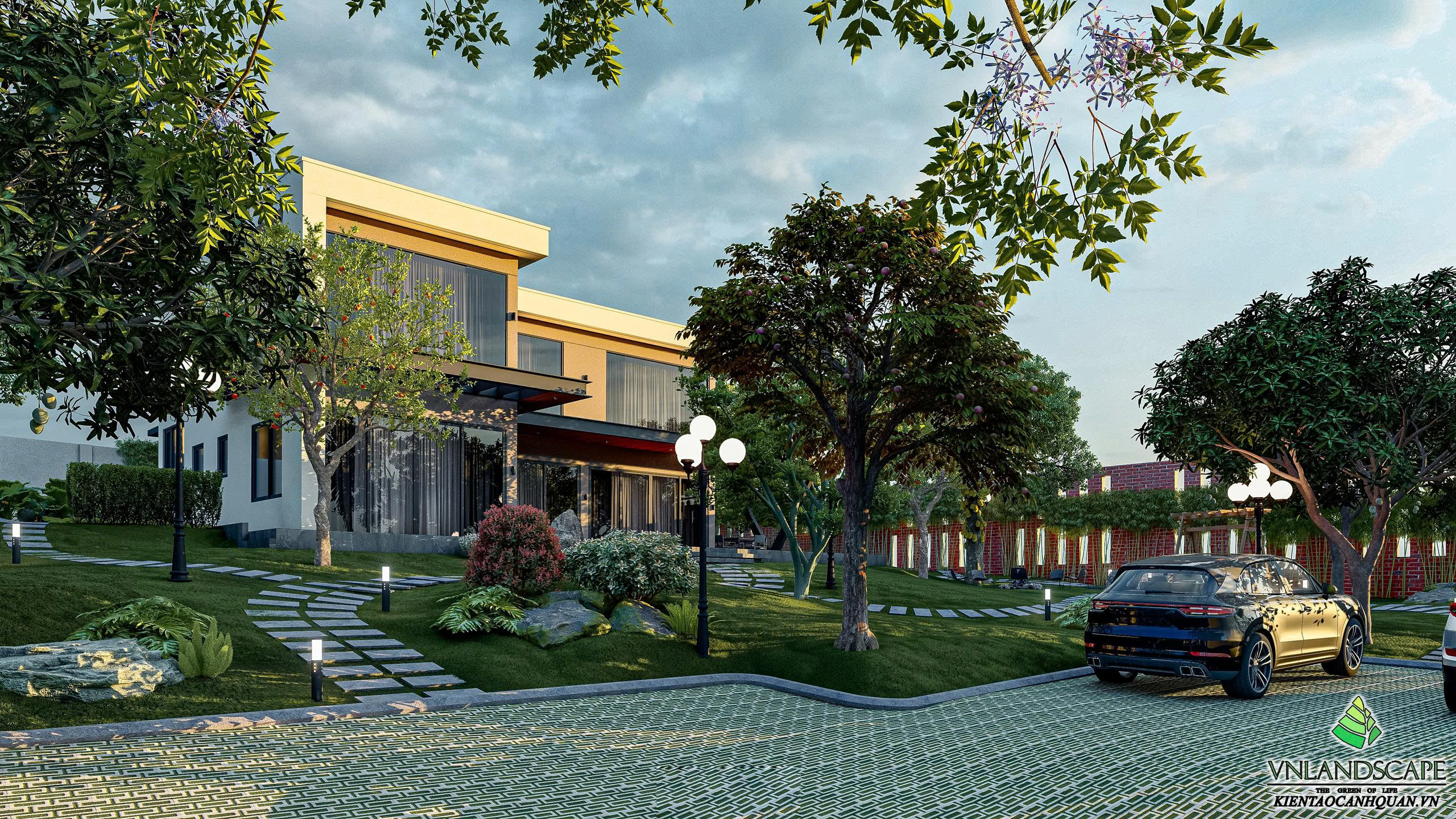 Khu nghỉ dưỡng của anh Vinh tại Hòa Lạc được thiết kế với triết lý “sống hòa cùng thiên nhiên”. Không gian cảnh quan mở, kết hợp hài hòa giữa mảng xanh cây cối, thảm cỏ, lối dạo uốn lượn, mang lại cảm giác thư giãn, tĩnh tại. Ngôi nhà mang phong cách hiện đại, đường nét kiến trúc tinh gọn, nổi bật giữa khung cảnh thiên nhiên xanh mát. Từng chi tiết trong thiết kế – từ bố cục sân vườn, cây trồng, đến hệ chiếu sáng – đều được cân nhắc kỹ lưỡng nhằm tạo nên một không gian nghỉ dưỡng riêng tư, thanh bình và tràn đầy năng lượng.