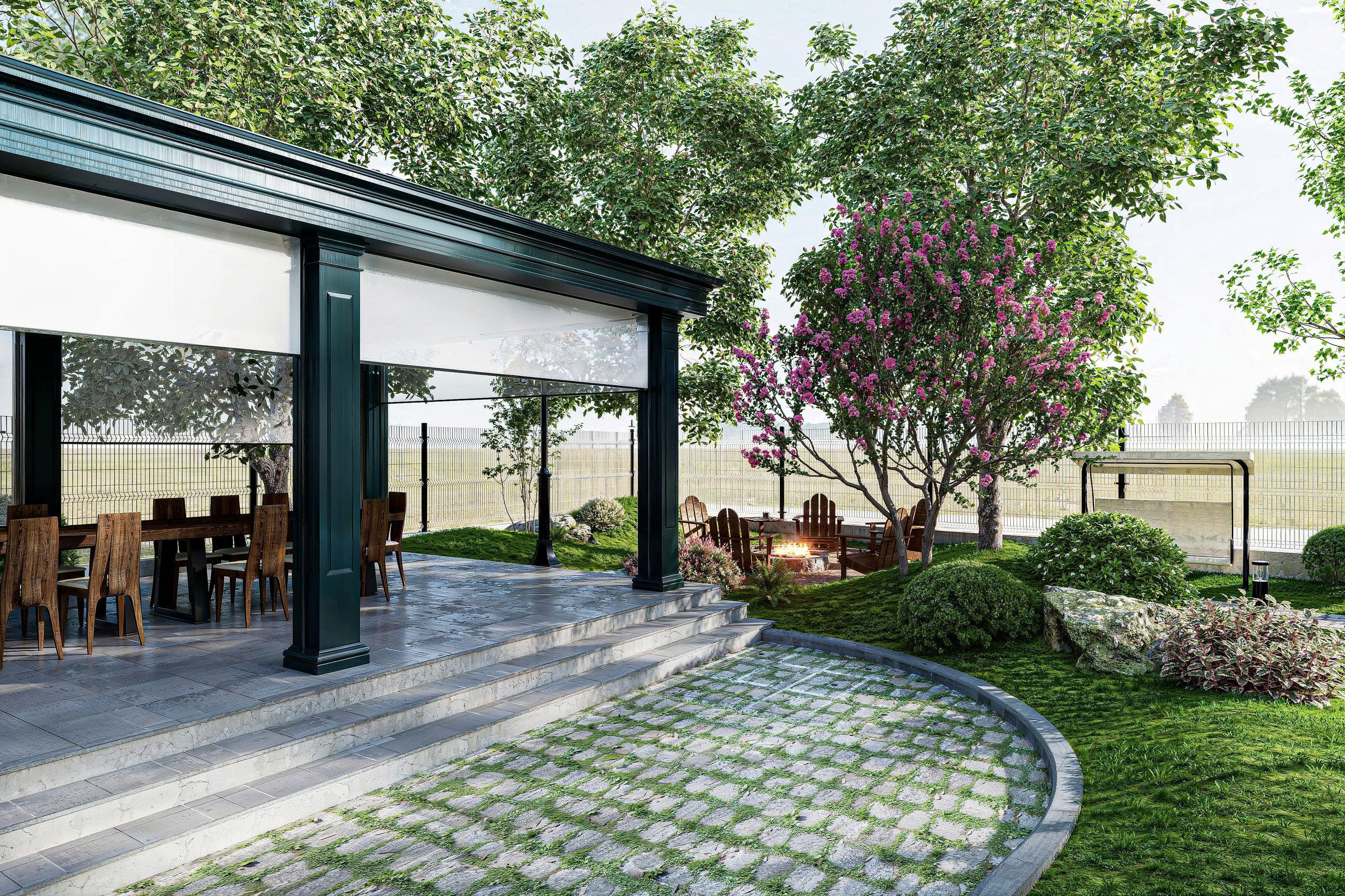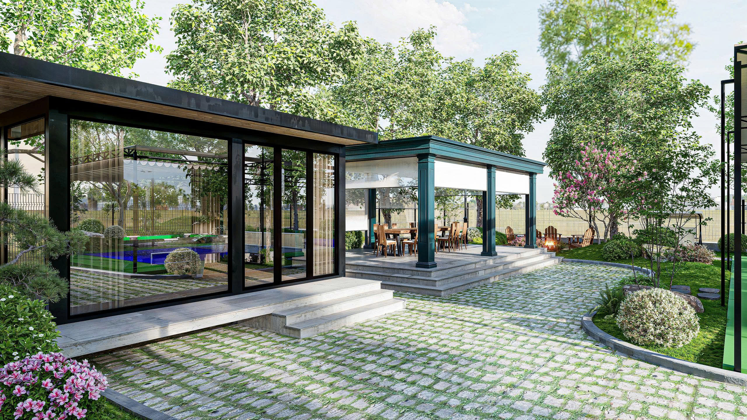 Khu nghỉ dưỡng cuối tuần được thiết kế như một không gian thư giãn riêng tư, nơi con người có thể tạm rời xa sự ồn ào của đô thị để tận hưởng những khoảnh khắc bình yên giữa thiên nhiên xanh mát. Tổng thể cảnh quan được tổ chức hài hòa giữa kiến trúc hiện đại và hệ thống cây xanh, tạo nên một môi trường nghỉ ngơi trong lành, gần gũi và đầy cảm hứng.