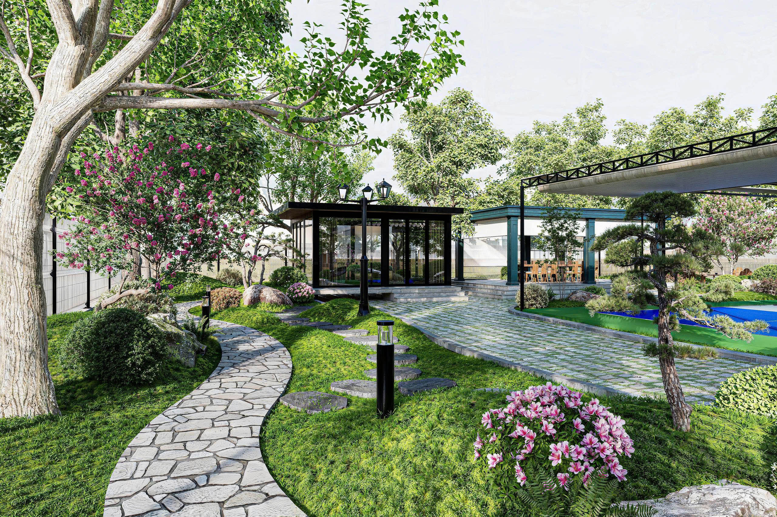 Xung quanh công trình là hệ thống đường dạo lát đá uốn lượn mềm mại, dẫn lối qua các tiểu cảnh cây xanh, thảm cỏ và những cụm hoa nở rực rỡ theo mùa. Các cây bóng mát được bố trí xen kẽ cùng đá cảnh và đèn sân vườn, mang lại vẻ đẹp tự nhiên và sinh động cho toàn bộ khu vườn.